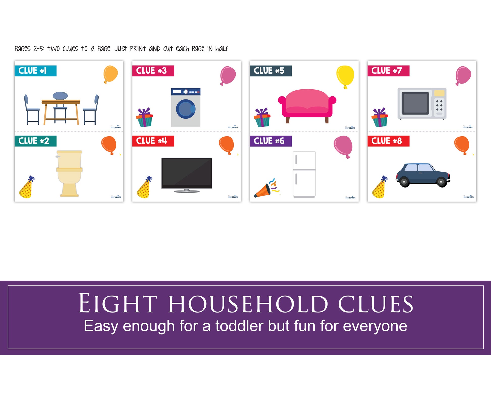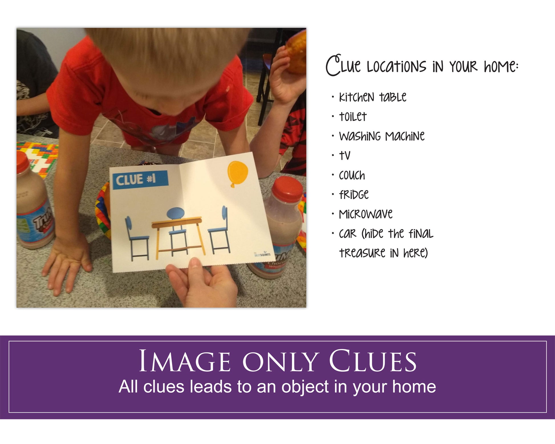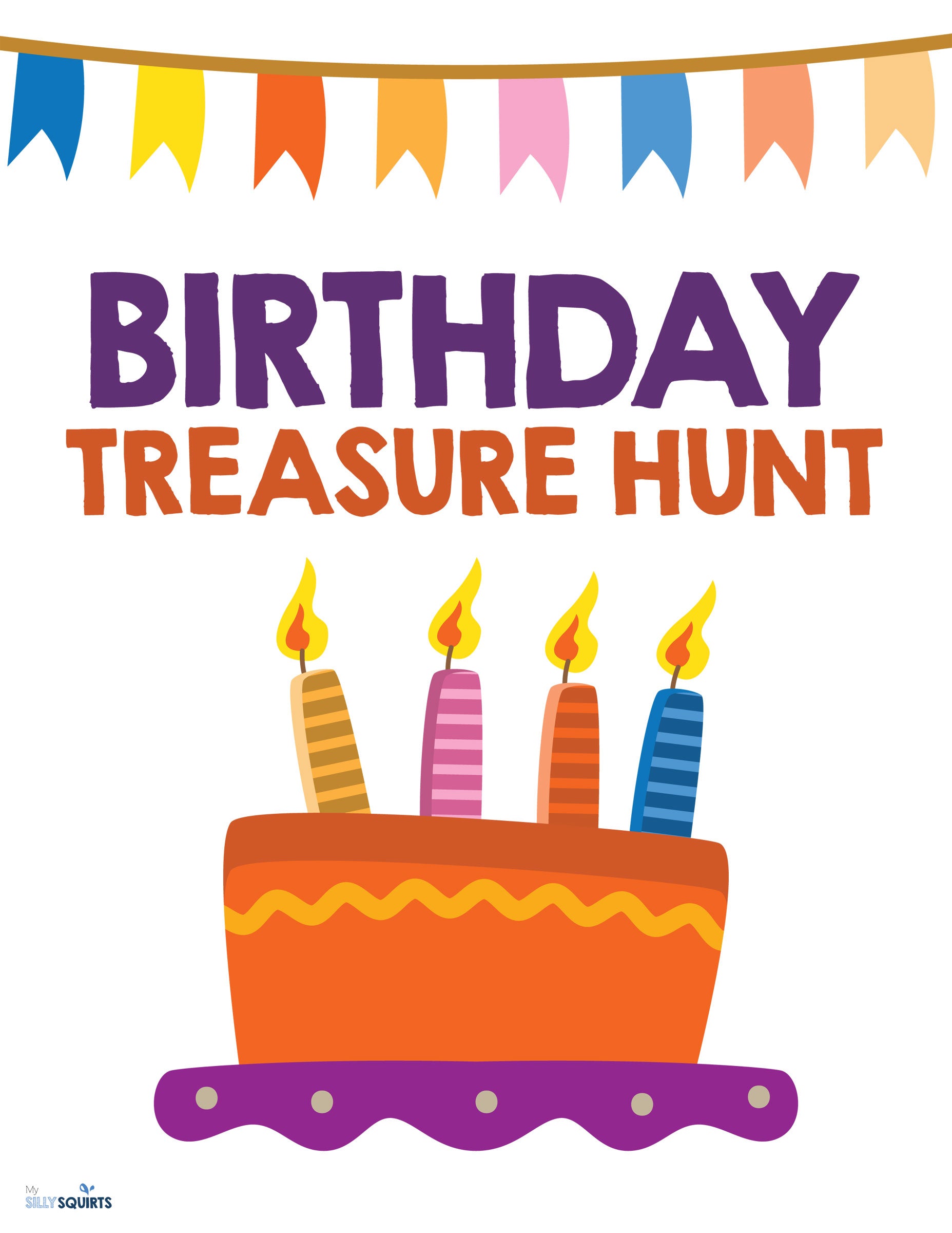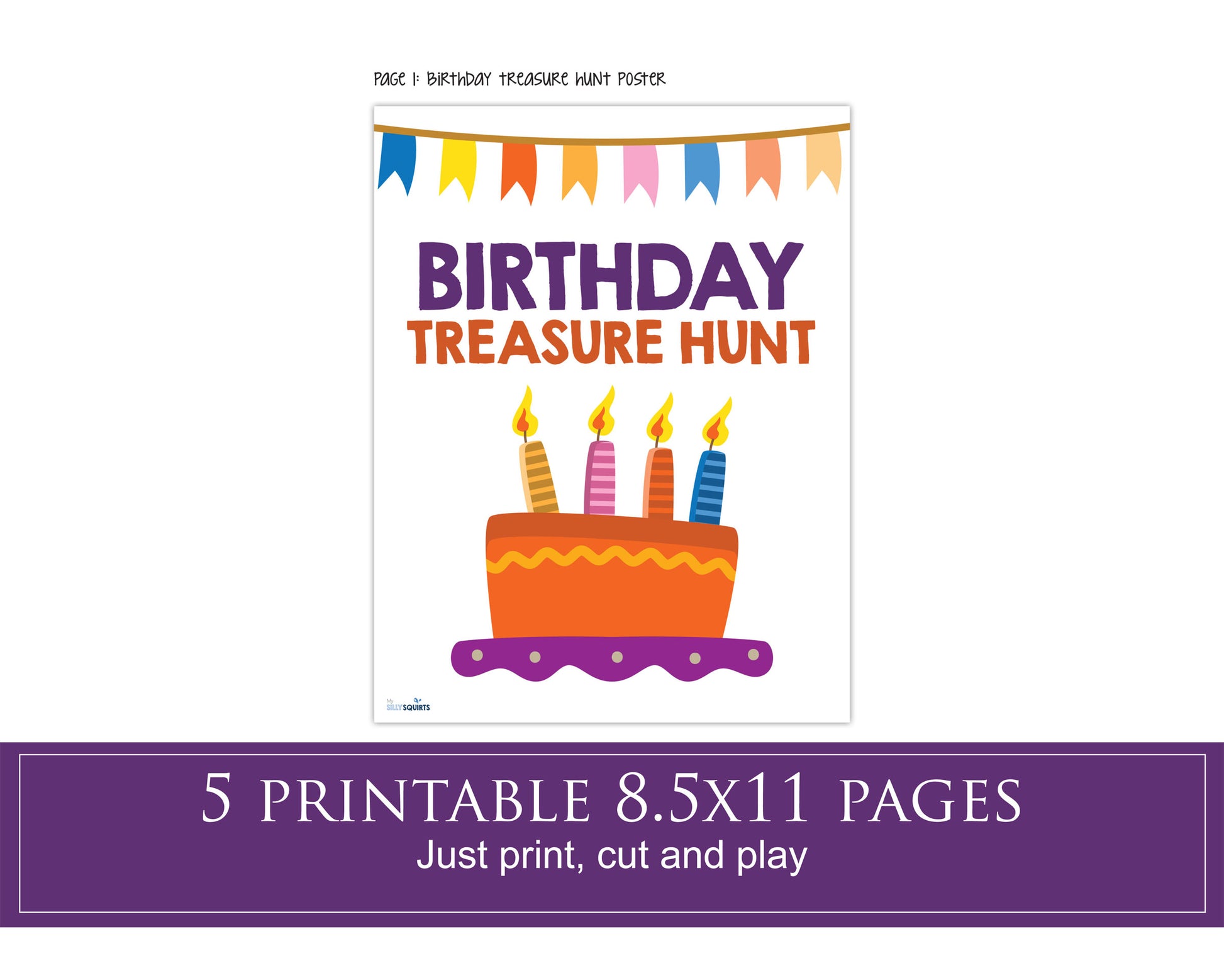 This easy and fun Birthday Treasure hunt includes five printable 8.5x11 PDF pages. There are eight clues that lead to items in your home. There are two clues to a page. Just print your treasure hunt from your home computer or email it to your local copy store. Then, cut out each clue and hide them throughout your home.