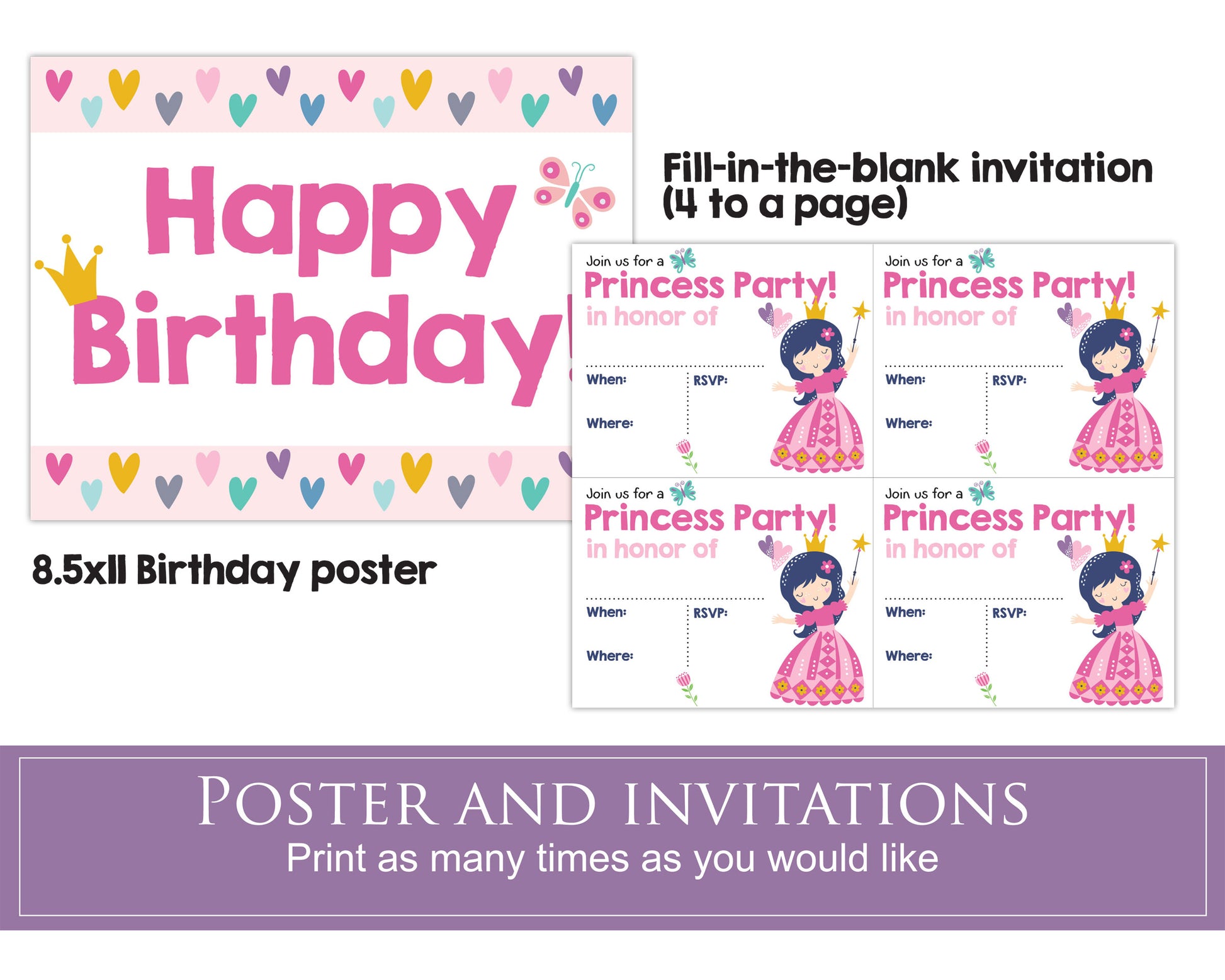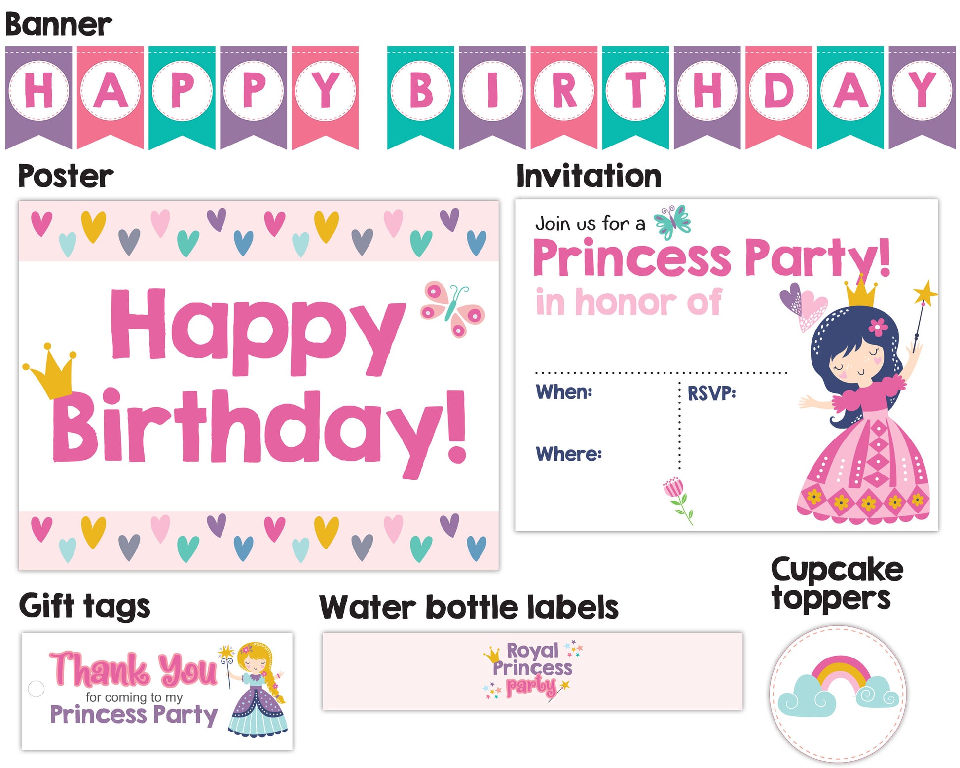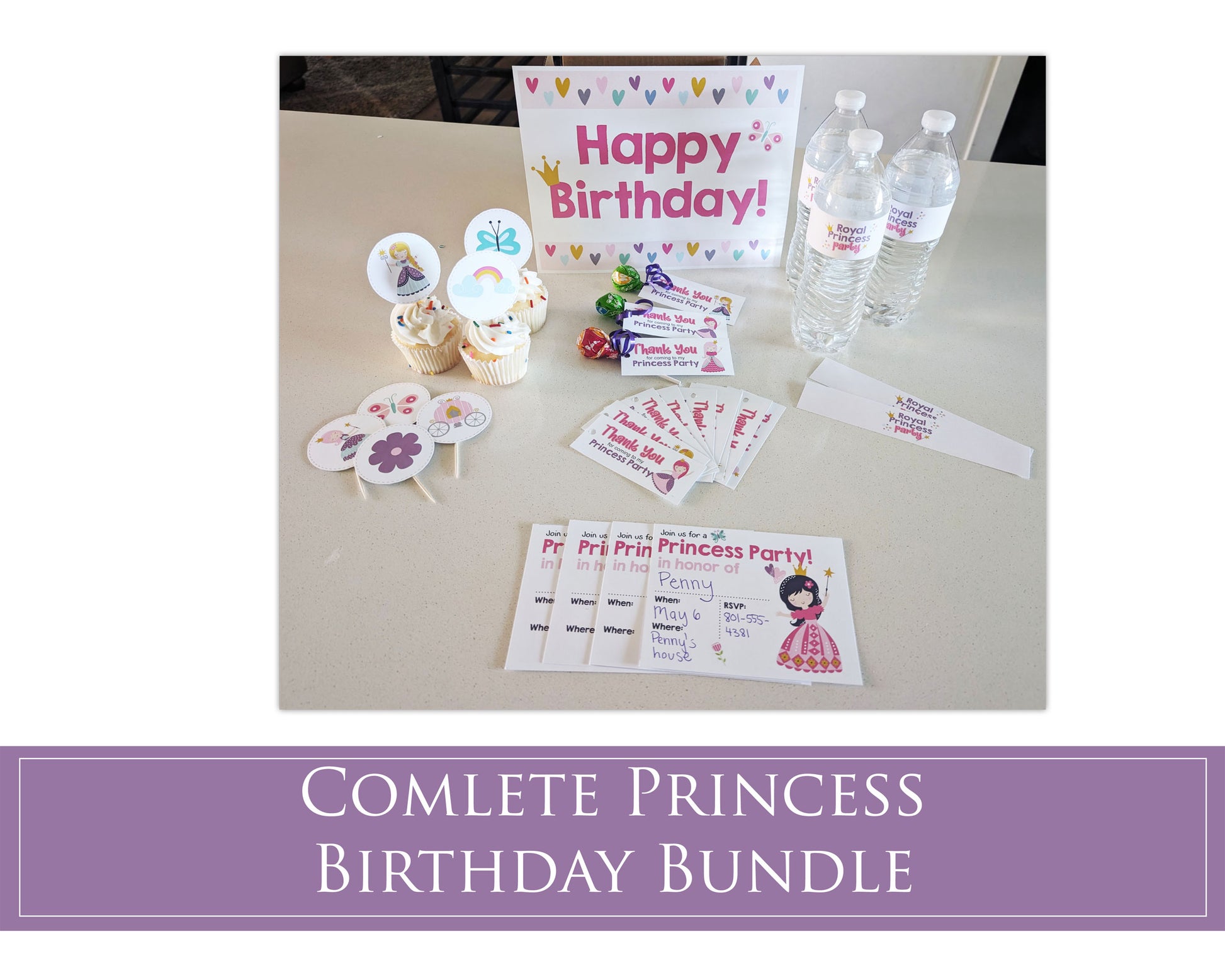 This adorable 12-page Princess Birthday Party bundle is everything you need to decorate and throw a fabulous princess party. This colorful and printable PDF is 8.5x11 inches and includes the following:
